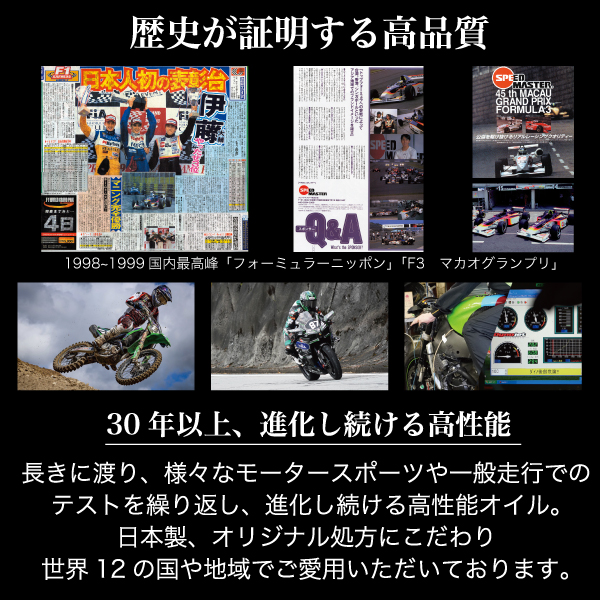 スピードマスターは、モータースポーツにおいて様々なカテゴリーのテクニカルサポートを行うとともに、その実戰でのデータに基づいた研究開発・改善・改良を繰り返し、ユーザーの皆様へ、常に最先端のテクノロジーを駆使した超高性能オイルを提供します。