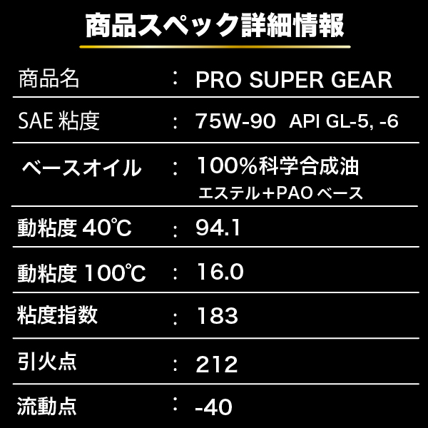 【100%化学合成ギヤオイルPRO SUPER GEAR【75W-90】API GL-5.6の特徴】