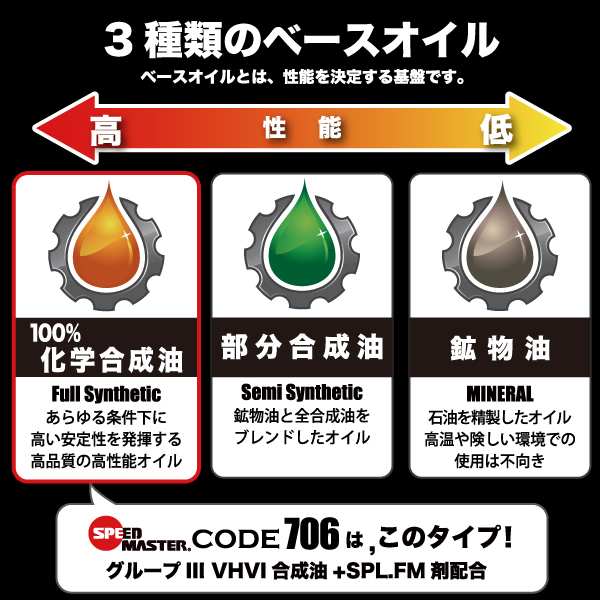 スピードマスター CODEシリーズ エンジンオイルにおいては、コストパフォーマンスを重視しながらスポーツ性能追求のため、ベースオイルをグループIIIVHVI基油を採用しています。