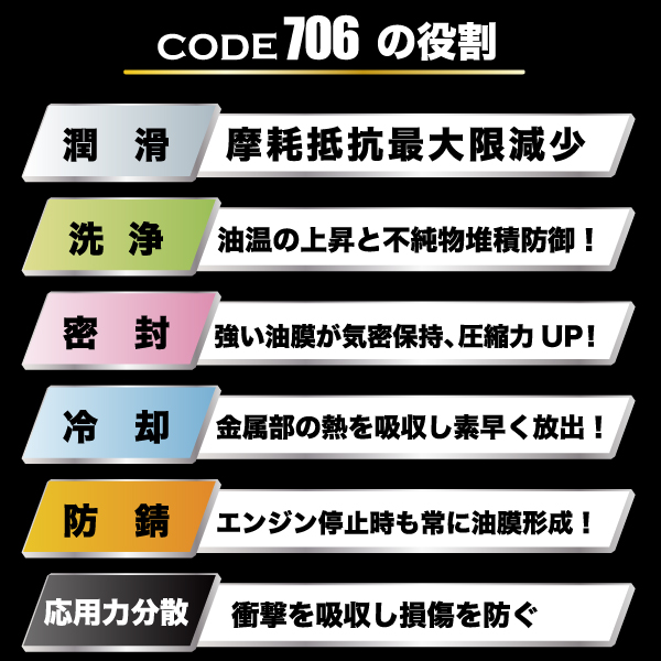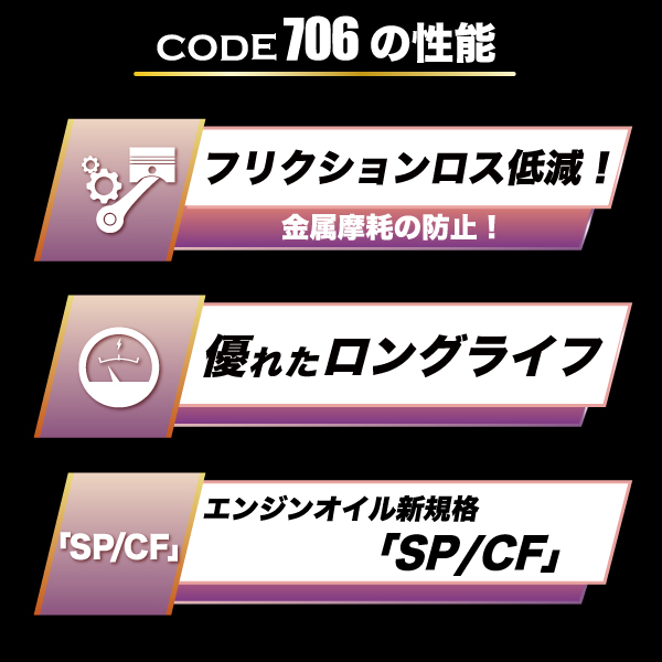 また、CODE700 シリーズは、スピードマスター、エンジンオイルの上位シリーズと同等の SPL.FM 剤の配合などによりスポーツ性能を強化し、一般的グループIII系合成油とは大きく異なりフリクションロス低減と金属磨耗を防止し、耐蒸発損失性に優れロングライフを実現しています。
