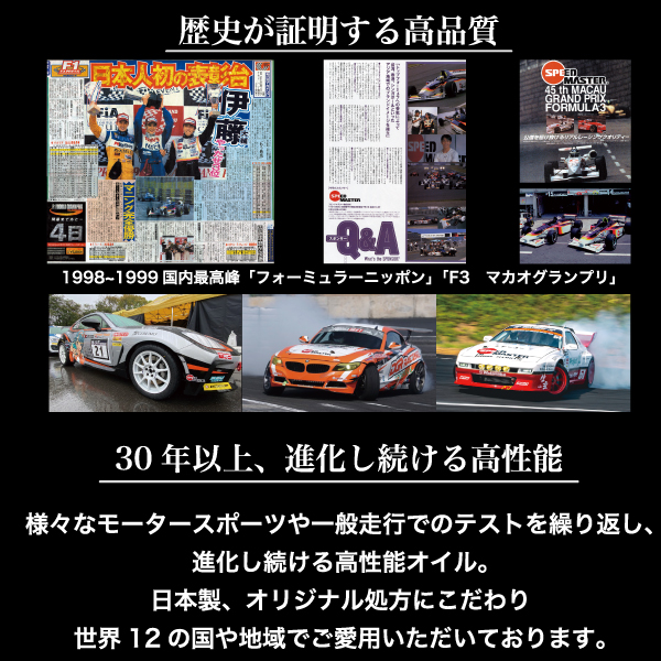 スピードマスターは、モータースポーツにおいて様々なカテゴリーのテクニカルサポートを行うとともに、その実戰でのデータに基づいた研究開発・改善・改良を繰り返し、ユーザーの皆様へ、常に最先端のテクノロジーを駆使した超高性能オイルを提供します。