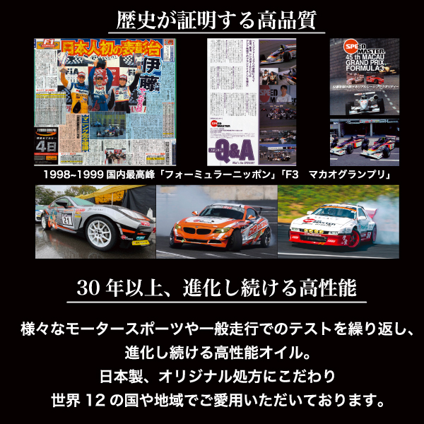 一般走行~サーキット走行および低温時~高温時まで、スムースで安定したシフトフィーリングを提供できる高性能100%化学合成ギヤオイルです。