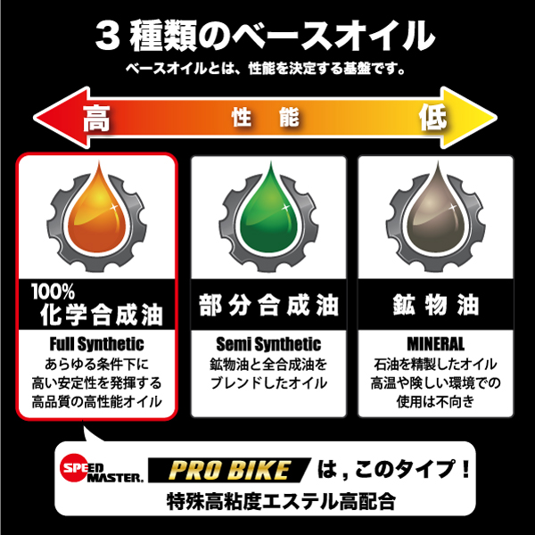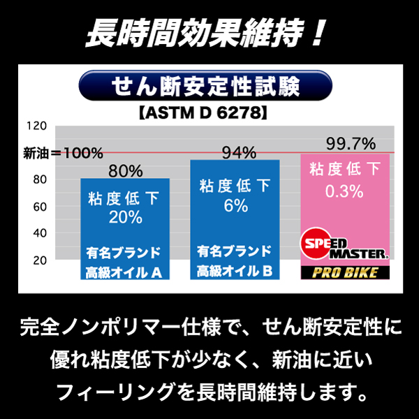 しかしながら、スピードマスターの「PRO BIKE」シリーズは、JASO(日本自動車技術協会)のMA規格に適合し、は、完全ノンポリマー処方でせん断による粘度低下が少ないため、新油に近いフィーリングを長時間維持します。