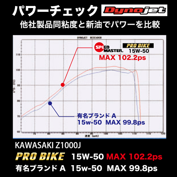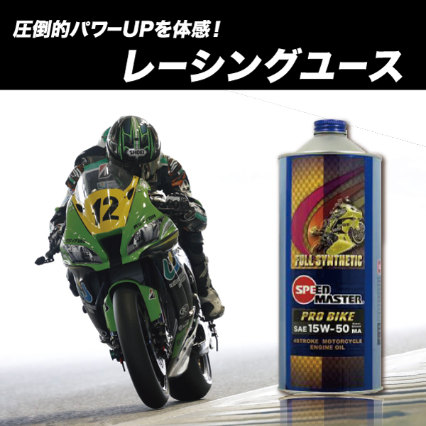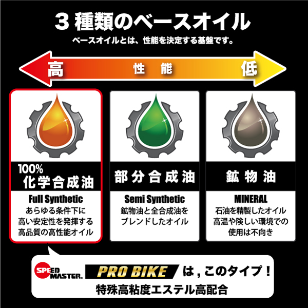 しかしながら、スピードマスターの「PRO BIKE」シリーズは、JASO(日本自動車技術協会)のMA規格に適合し、は、完全ノンポリマー処方でせん断による粘度低下が少ないため、新油に近いフィーリングを長時間維持します。