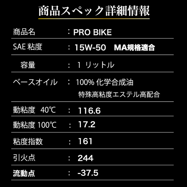 - > PRO BIKE 【15W-50 MA】 1L 特殊高粘度エステルベース 100%化学合成油