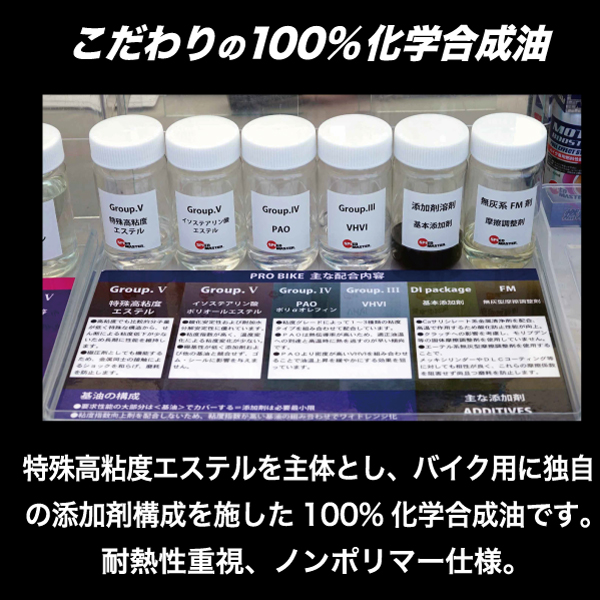 バイクでの使用を前提とした高性能100%化学合成油です。