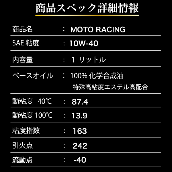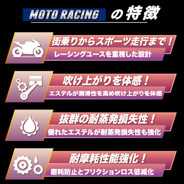 - > MOTO RACING 10W-40 1L 高粘度エステルベース 100%化学合成油