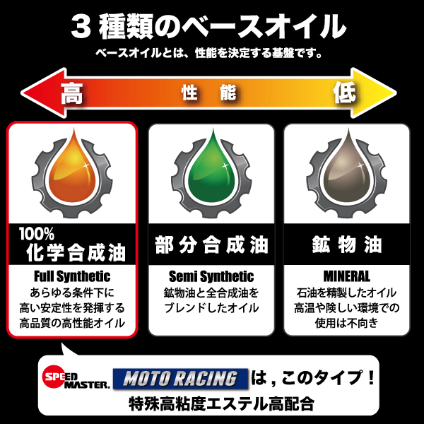 スピードマスターが4輪用に置いて培った技術を二輪用にモディファイした処方で、エンジンタイプによる要求性能を満たすために粘度設定によって特性を変えています。