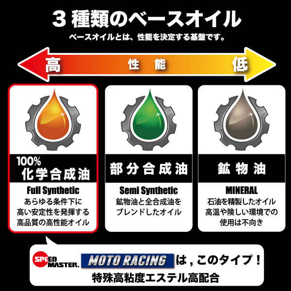 スピードマスターが4輪用に置いて培った技術を二輪用にモディファイした処方で、エンジンタイプによる要求性能を満たすために粘度設定によって特性を変えています。