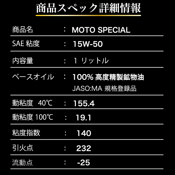 - > MOTO SPECIAL 【15W-50 JASO MA規格適合】 1L スポーツ性能強化