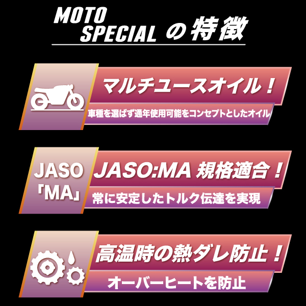 「JASO MA規格」に適合し湿式クラッチの滑りを抑え、安定したトルク伝達を実現すると共に、ベースオイルにあえて高品質な鉱物油を使用したことでシール材との相性を選ばない設計。