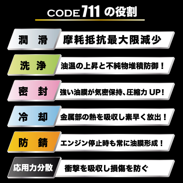 また、CODE700 シリーズは、スピードマスター、エンジンオイルの上位シリーズと同等の SPL.FM 剤の配合などによりスポーツ性能を強化し、一般的グループIII系合成油とは大きく異なりフリクションロス低減と金属磨耗を防止し、耐蒸発損失性に優れロングライフを実現しています。
