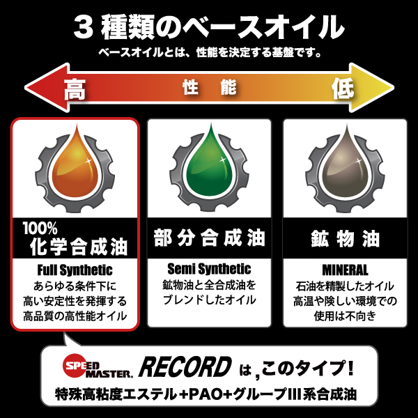 日常の町乗りからスポーツ走行まで幅広く対応するオイルです。 ベースオイルは、イソステアリン酸フルエステル+PAO+グループIII系合成油による構成 で耐熱性重視の専用設計でノンポリマー仕様です。